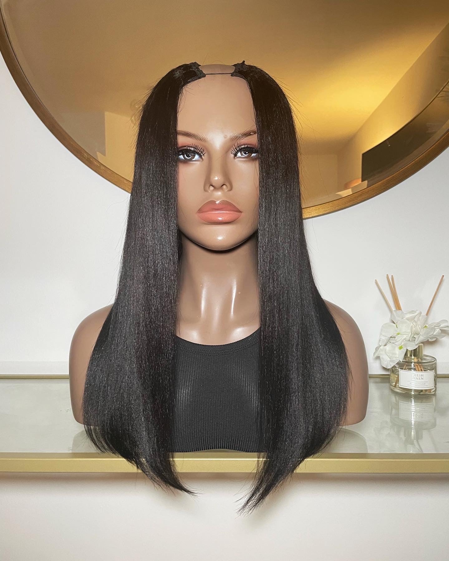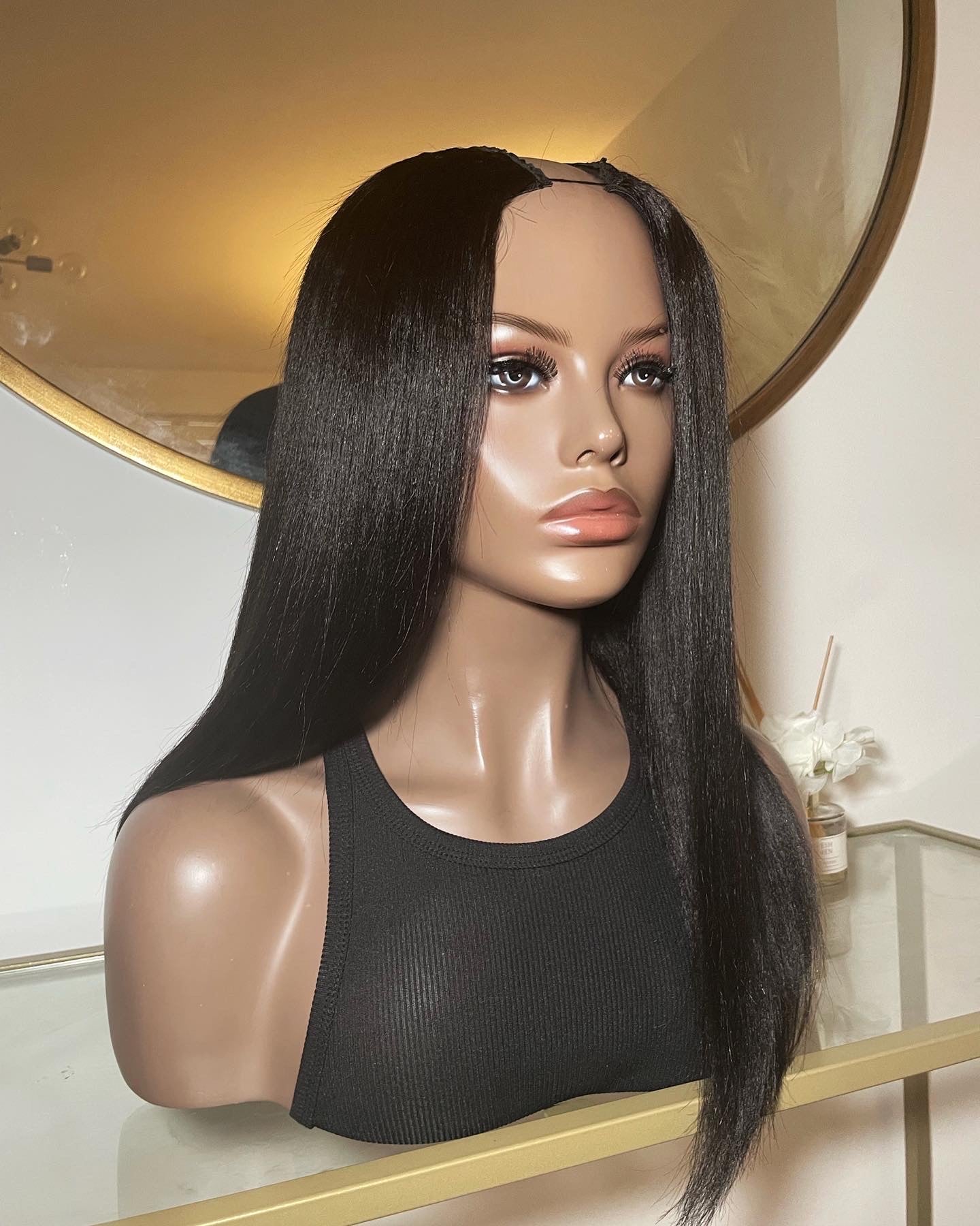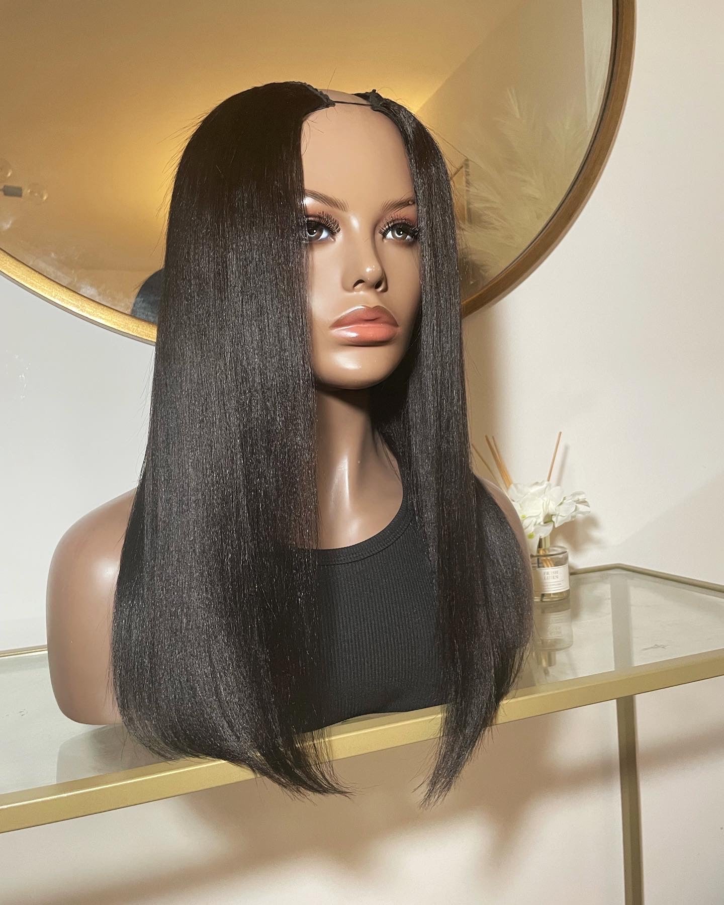 Calling all natural babes! Our Yaki straight is the perfect texture to blend with your natural hair! Achieve a natural ‘sew-in’ look with our ready to wear U-Part wigs! These wigs can be worn with clips, combs or sewn in. Please mention at check out if you would like combs or clips.